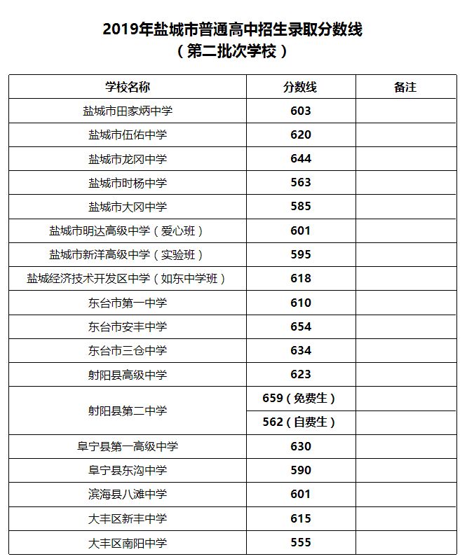 2019盐城中考录取分数线(第二批次、县区第一批次等)