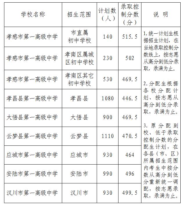 全市一般普通高中学校录取最低控制分数线为:孝感市直属初中学校330分;孝南区330分;孝昌县310分;大悟县317分;云梦县380分;应城市357分;安陆市387分;汉川市347分。根据学校招生计划,按照“考生分数优先、遵循志愿顺序”的原则录取,录满为止。