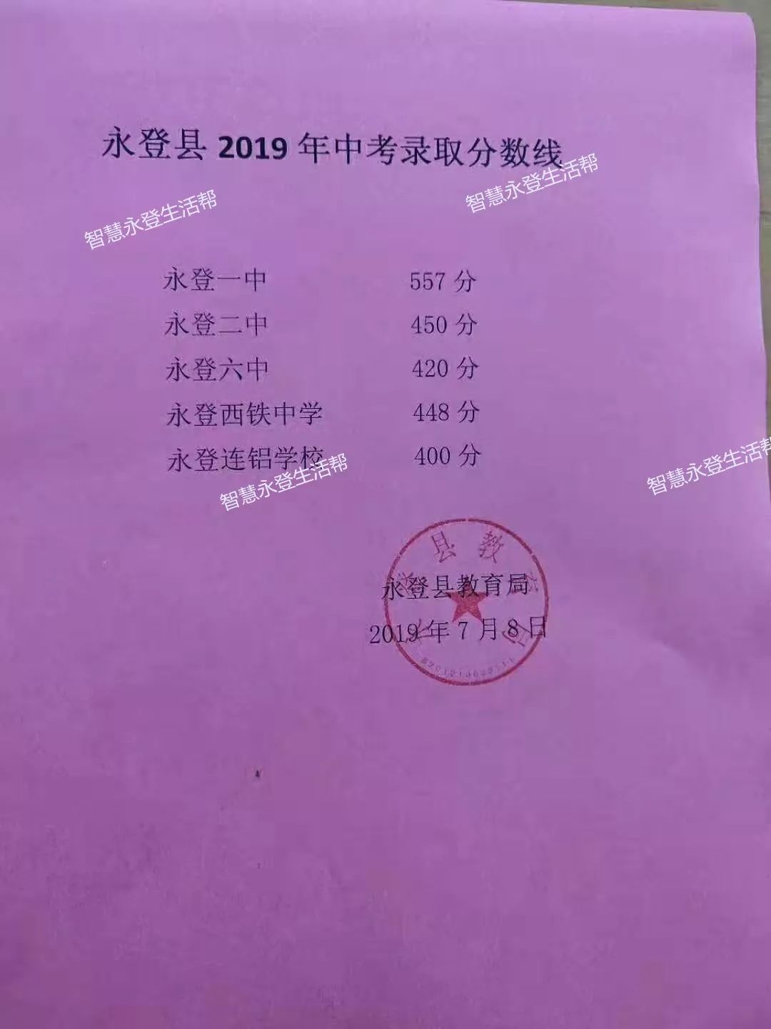 2019永登县中考分数线(永登一中、二中、五中、西铁中学)