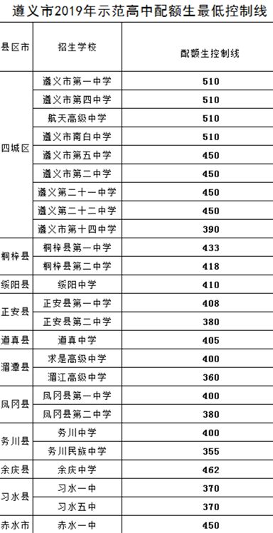 同时公布的还有省级示范高中配额生最低控制线(即各校最低录取线)。遵义市第一中学、遵义市第四中学、遵义航天高级中学、遵义市南白中学四所龙头高中的配额生最低控制线均为510分,比去年提高30分。