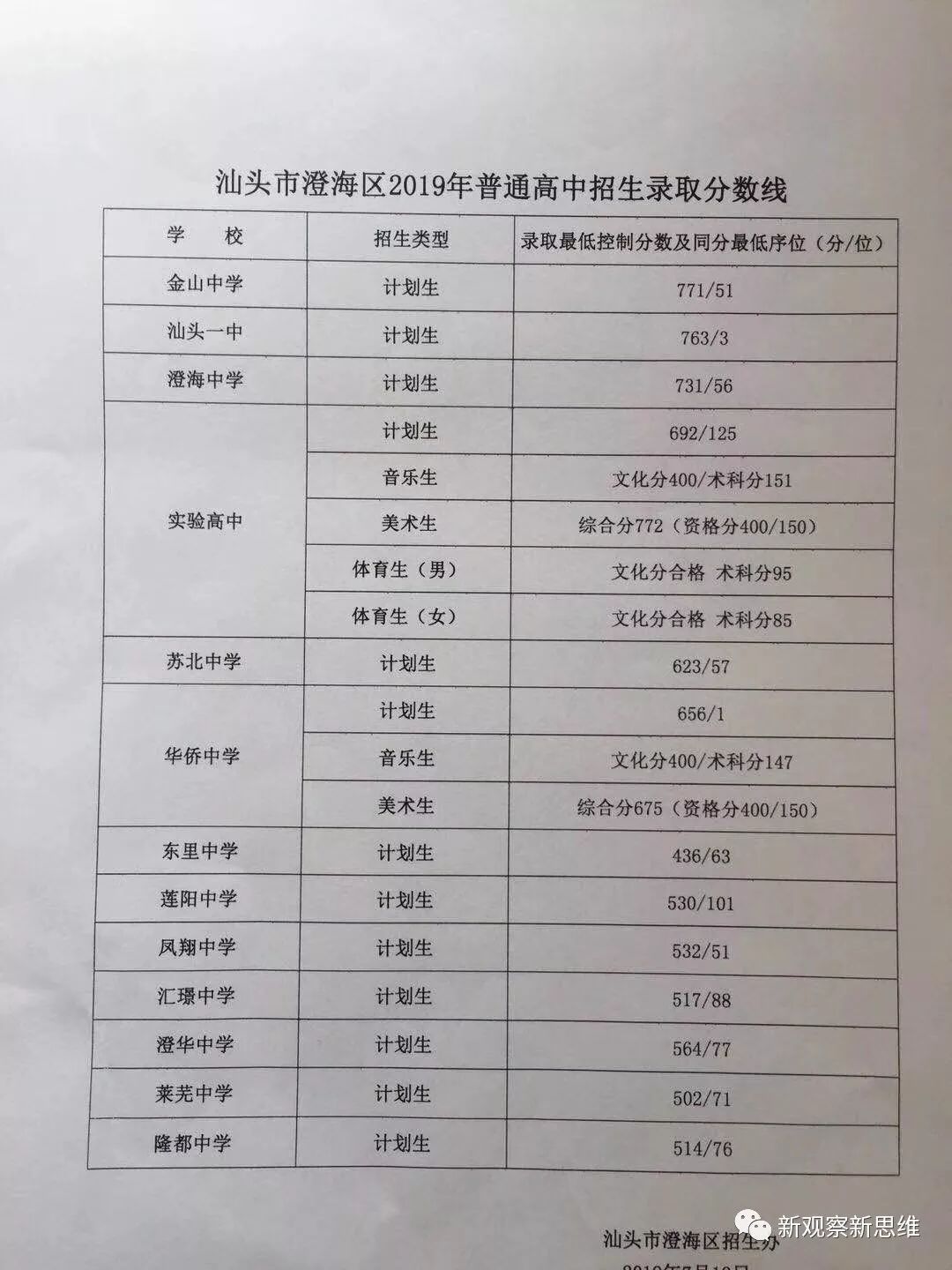 2019汕头市澄海区中考录取分数线