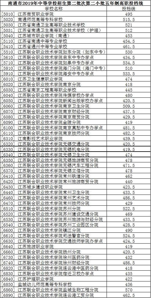 南通市2019年中等学校招生第二批次第二小批五年制高职投档线