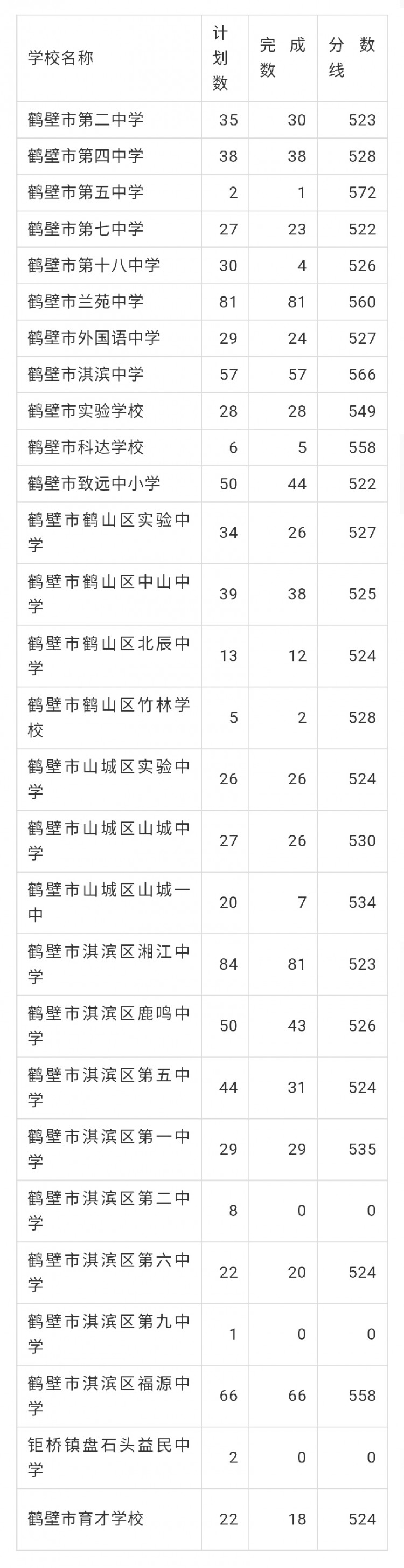 1、鹤壁市高中分配生计划完成情况及录取分数线