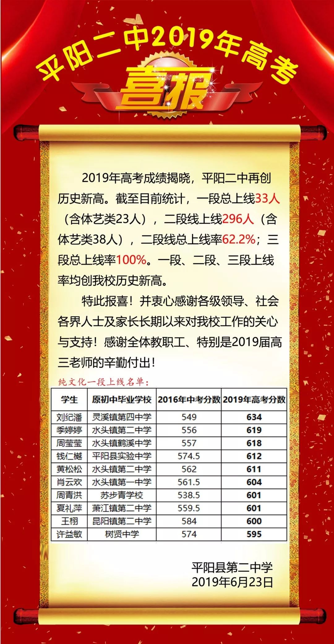 2019平阳二中录取分数线(附2019高考成绩喜报)