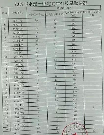 永定一中统招生 等级线10C 最低投档分数线615分 录取人数906人