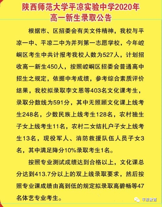陕西师范大学平凉实验中学2020年录取分数线