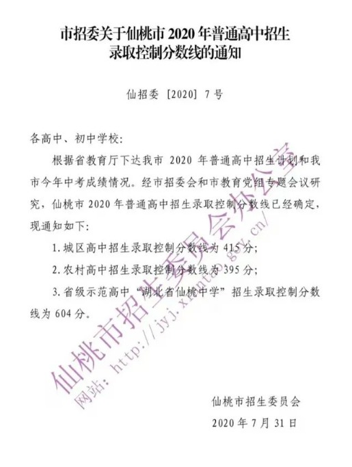 市招委关于仙桃市2020年普通高中招生录取控制分数线的通知