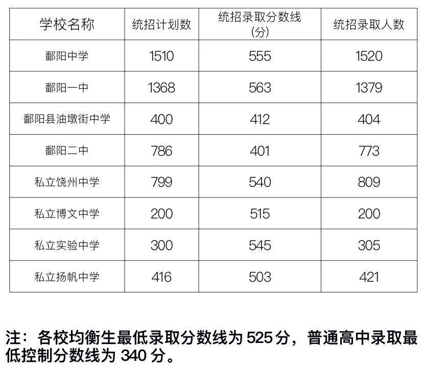 注:各校均衡生最低录取分数线为525分,普通高中录取最低控制分数线为340分。