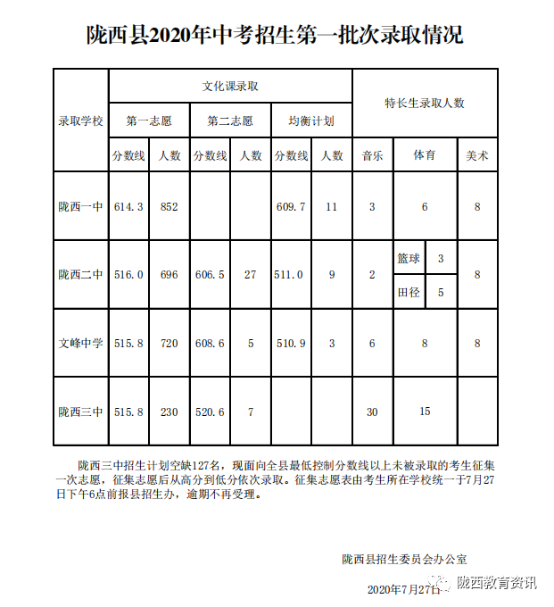 2020定西陇西县高中分数线