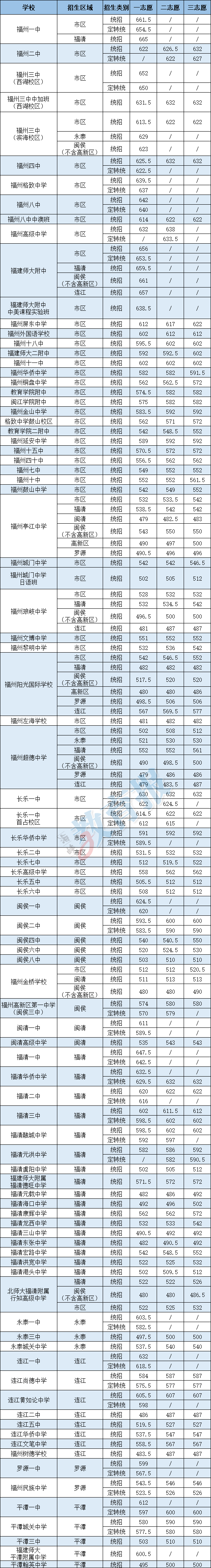 8月10日,福州市第一批普高继续逐10分降至普高最低投档控制线(479分),按志愿顺序从高分到低分一次性轮转投档录取。现将普高学校最低录取分数线公布如下: