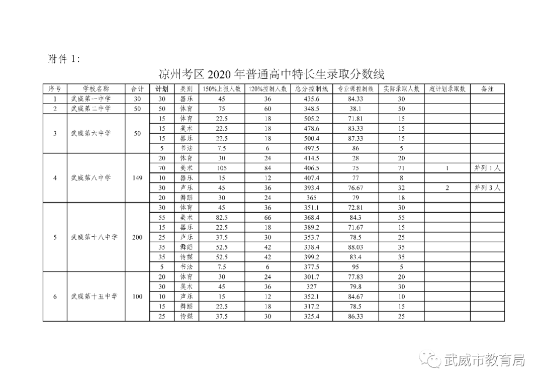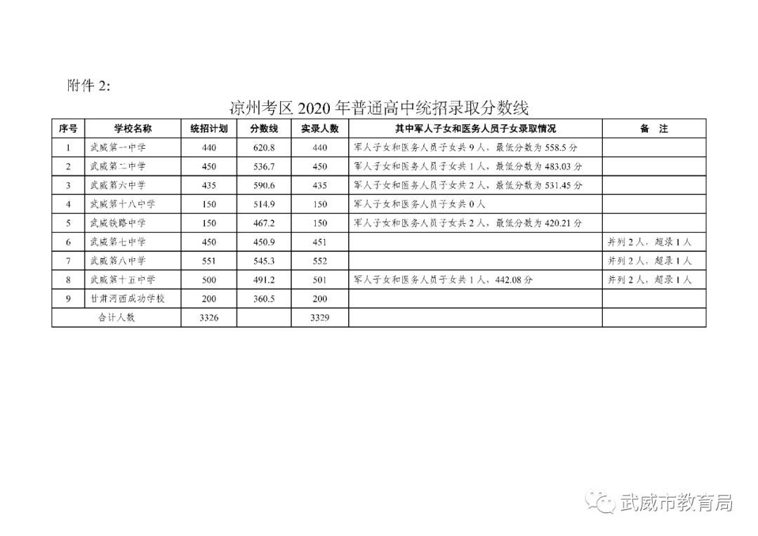 武威市凉州考区2020年普通高中招生录取分数线公布