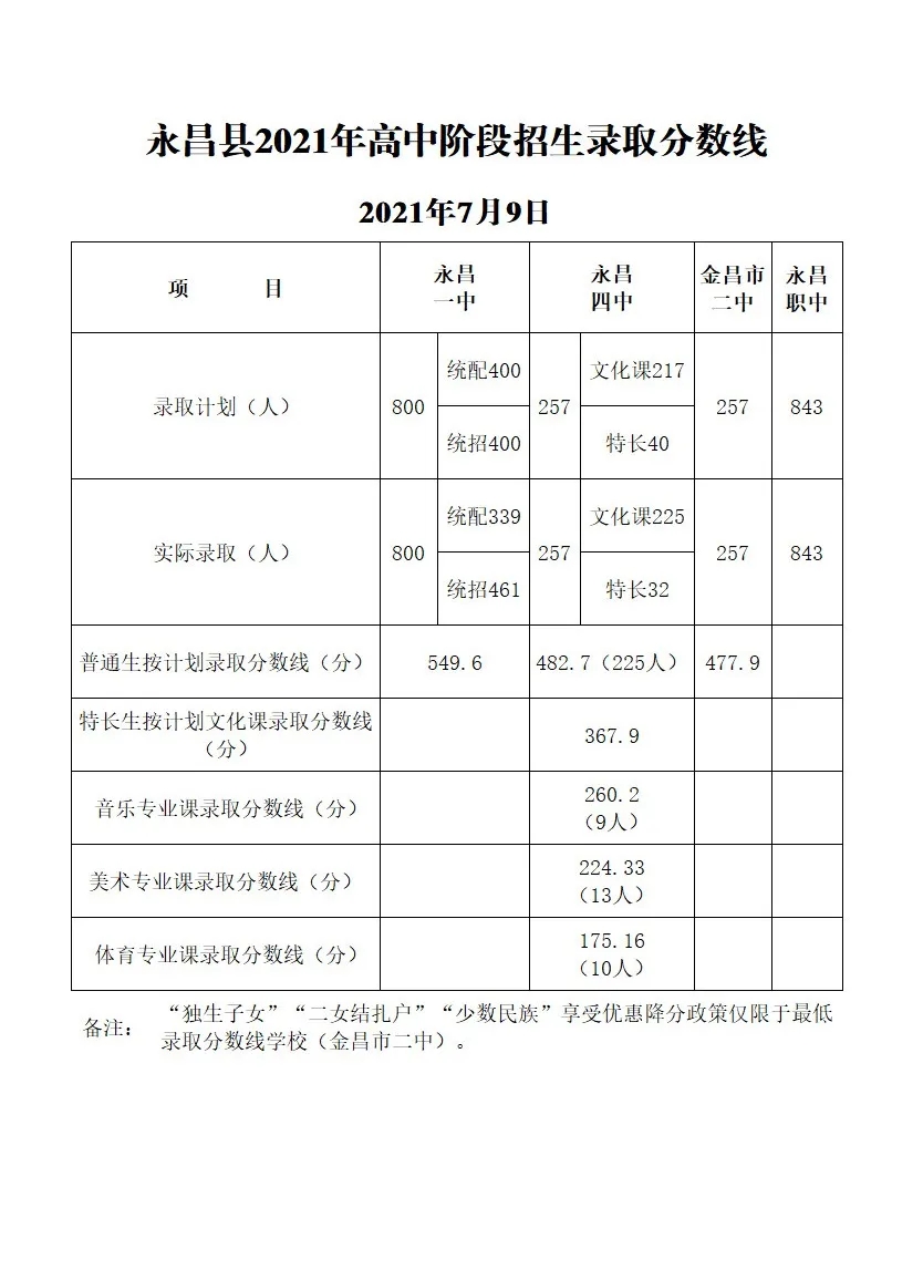 2021年永昌县高中招生录取分数线公布,具体如下: