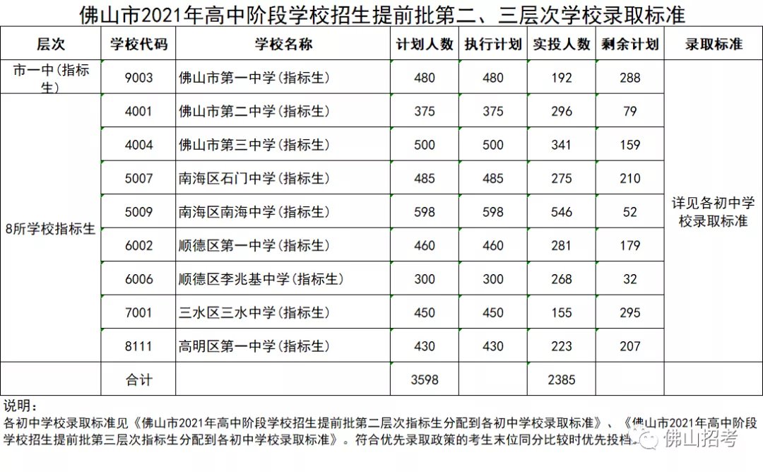 经研究,2021年佛山市高中阶段学校招生提前批、第一批录取控制分数线及学校录取标准如下: