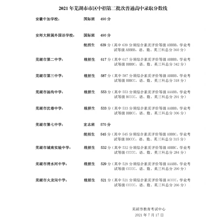 2021年安徽芜湖市区中招第二批普高录取分数线公布