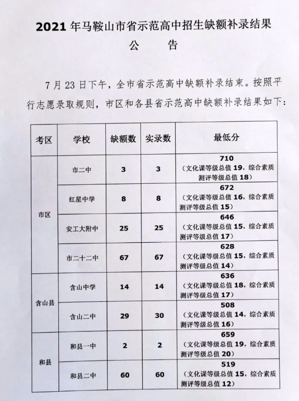 2021年马鞍山中考省示范高中招生缺额补录分数线结果公告