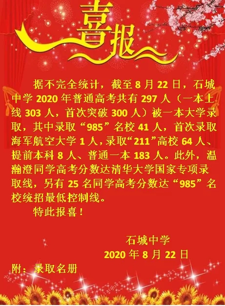 2020石城中学高考喜报成绩、一本二本上线人数情况