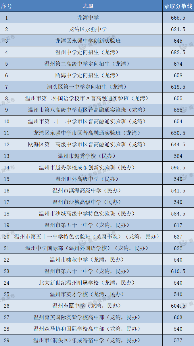 温州二中以669分排名第二,其中特色班为672.5分。瓯海区定向招生667.5分,排名第三。龙湾中学以666.5分排名第四。