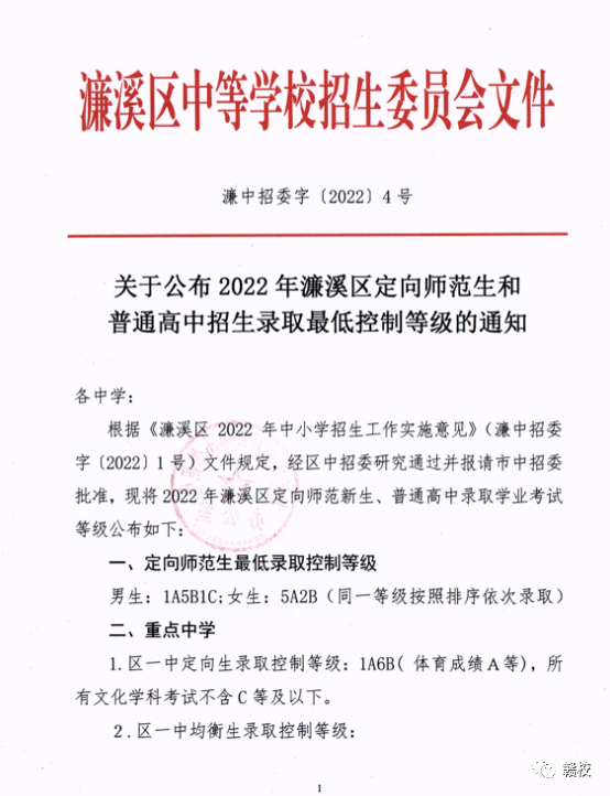 濂溪区一中定向生录取控制等级1A6B(体育成绩A等);2022年濂溪区一中均衡生最低控制等级1B6C;2022年九江新港中学录取控制等级1B5C1D(体育成绩A等)。