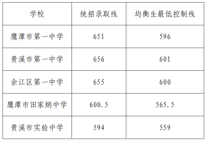 均衡生按各初中学校均衡生计划,按考生成绩从高到低录取,但不得低于各重点高中均衡生最低控制线,2022年报考鹰潭市第一中学、贵溪市第一中学、余江区第一中学均衡生考生,录取时考生的学业成绩可在本校统一招生录取线基础上下降55分,报考鹰潭市田家炳中学、贵溪市实验中学均衡生的考生,录取时考生的学业成绩可在本校统一招生录取线基础上下降35分。