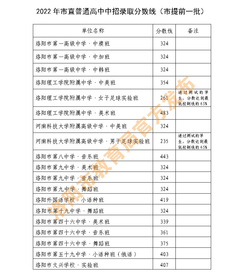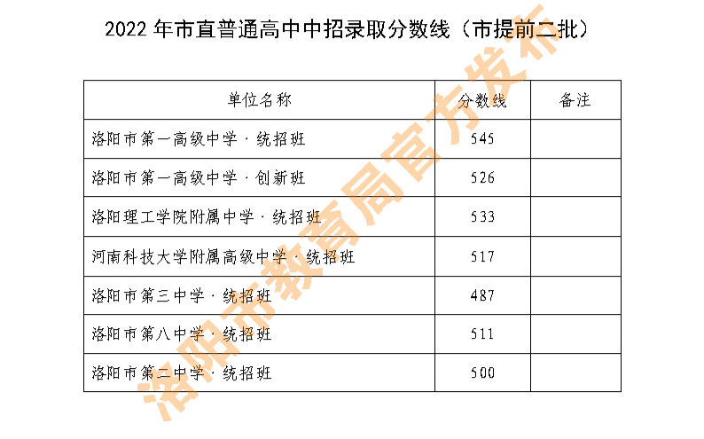 7月16日,洛阳市教育局公布了2022年市直普通高中录取分数线。分为市提前一批、市提前二批、市批次一批,市批次二批四个批次。
