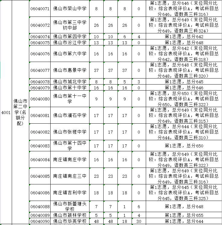 面向区内招生的名额分配,各学校录取分数线控制在不低于该校普通生录取分数线15分以内。未完成计划总计800个,转入第四层次面向全市招生。