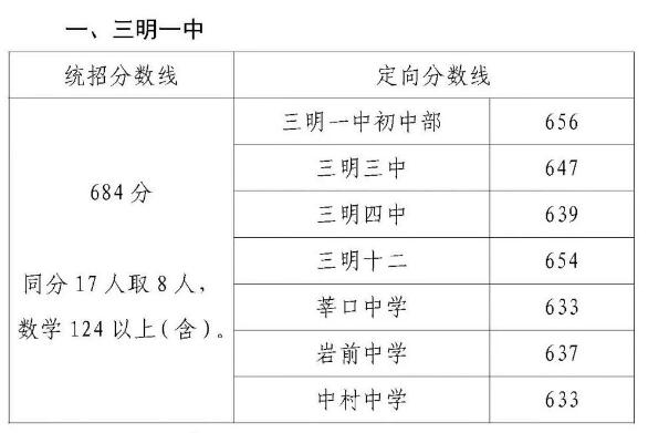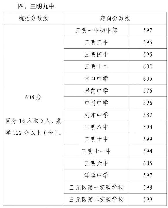按照《三明市教育局关于印发三明市2022年高中阶段学校招生录取办法的通知》(明教中〔2022〕69号)的相关规定,组织各县(市、区)在市中考中招录取平台上统一切线,全市普通高中招生录取工作已完成,现将2022年市区普通高中招生录取分数线公告如下: