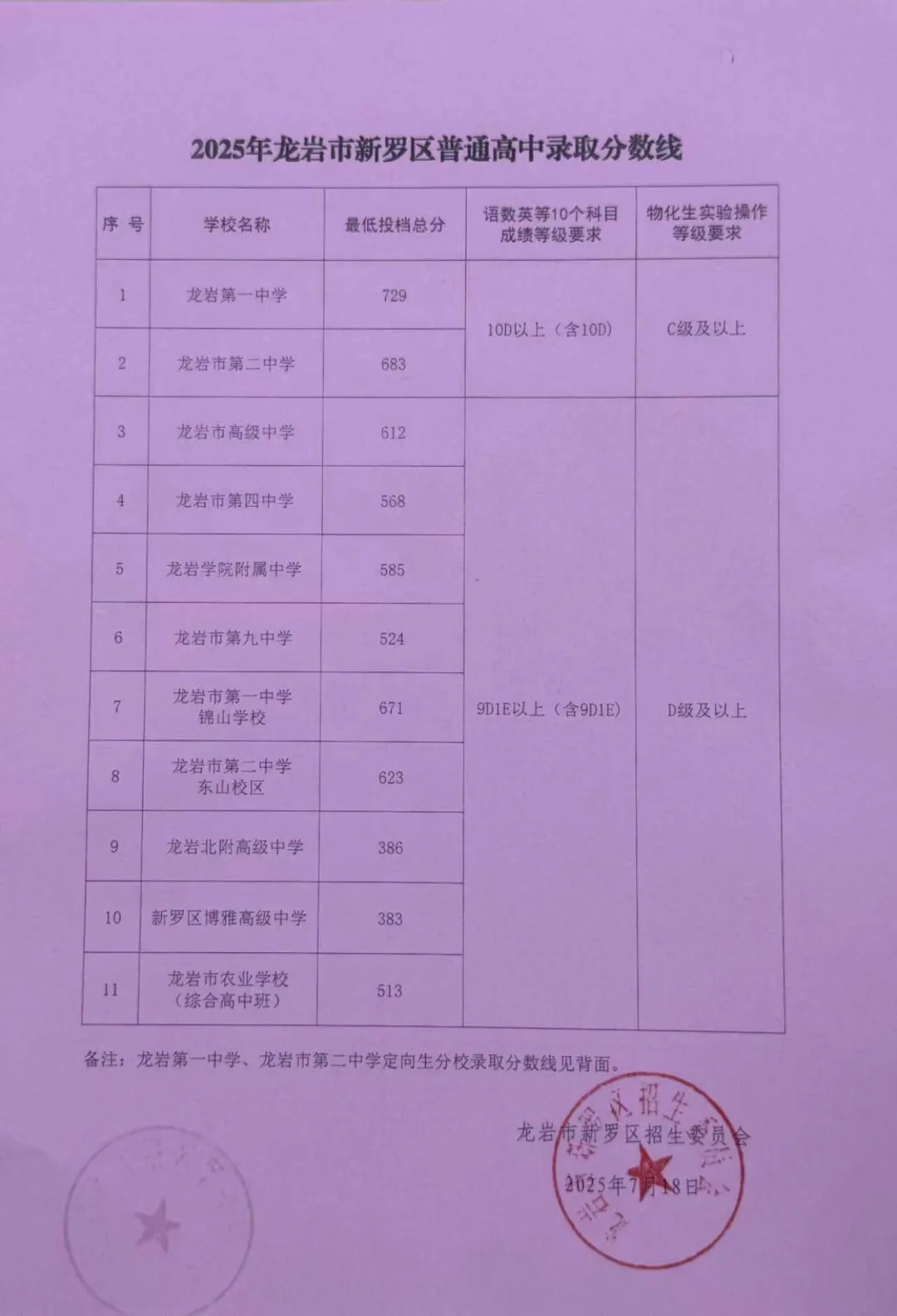 2025年龙岩市龙岩市高中招生录取分数线公布,具体如下: