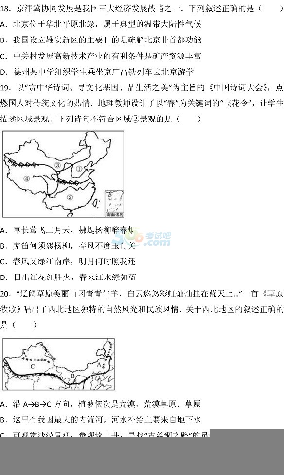 2017年德州市中考地理试题及参考答案,精英中考网消息:2017年德州市中考已经结束,六月,又有一批新的考生参加2018中考,为了帮助广大考生更好的复习备考,小编收集整理了2017德州中考各科试题及参考答案,供广大考生参考,下面是2017德州中考地理试卷及答案