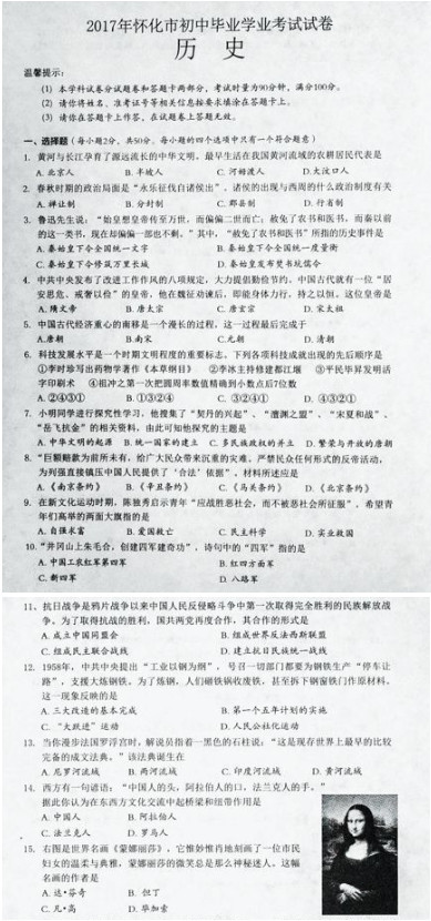 精英中考网www.52zhongkaow.com消息:2017年怀化市中考已经结束,又有一批新的初三考生即将参加2018中考,为了帮助广大师生更好的备考,小编收集整理了历年怀化中考试题及参考答案,供广大考生参考,下面是2017怀化中考历史试卷试题及参考答案