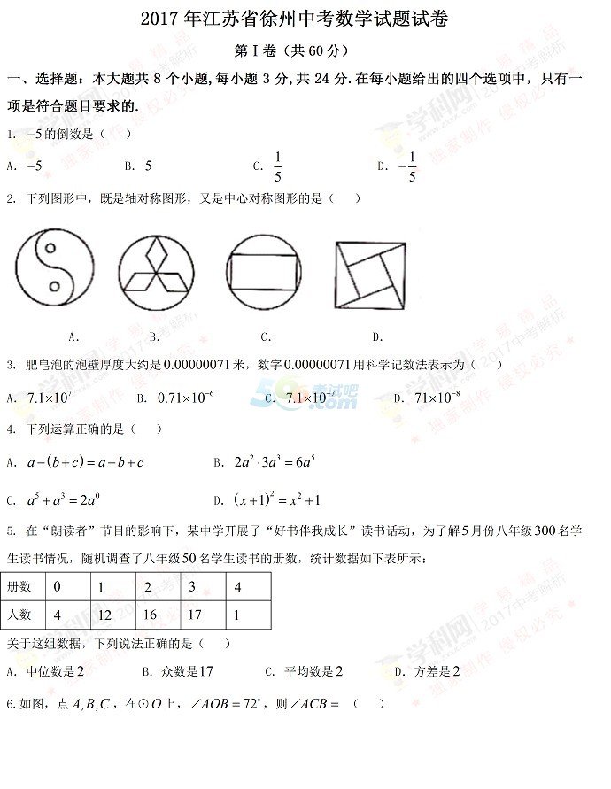 考试吧:江苏省徐州市2017年中考《数学》试题