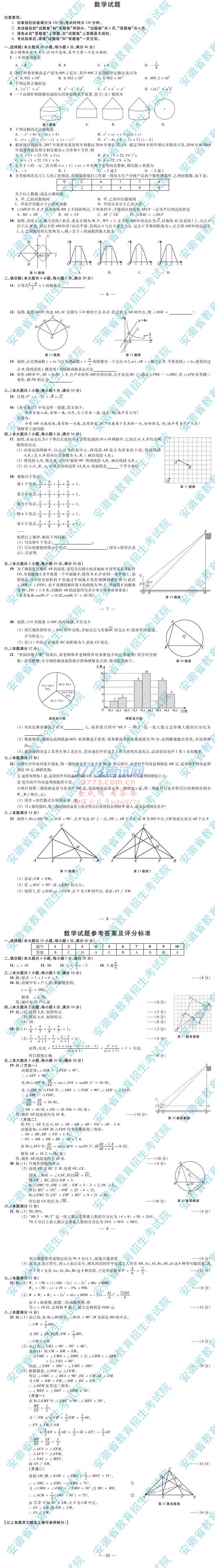 2018安徽中考数学试题试卷及答案、评分标准