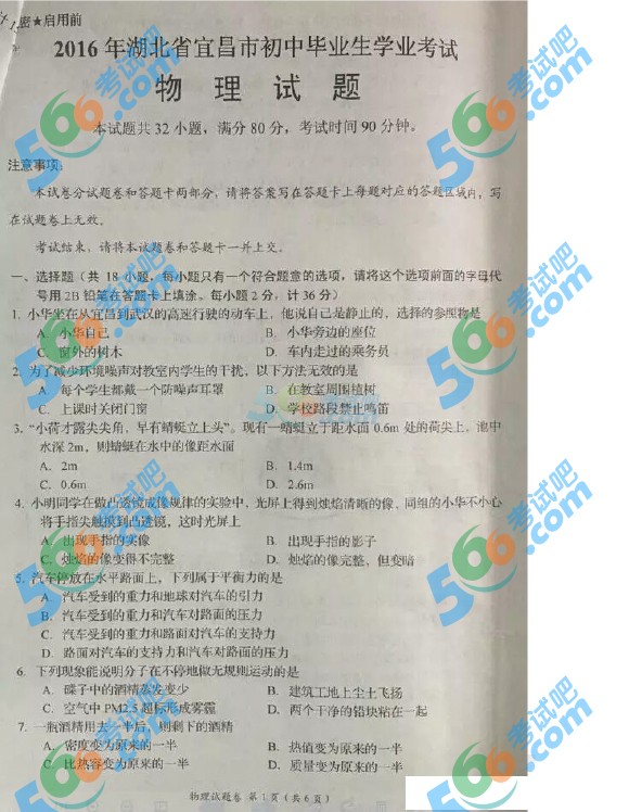 精英中考网www.52zhongkaow.com消息:2017年宜昌市中考已经结束,又有一批新的初三考生即将参加2018宜昌中考,为了帮助广大师生更好的备考,小编收集整理了历年宜昌中考试题及参考答案,供广大考生参考,下面是2016宜昌中考物理试题及参考答案