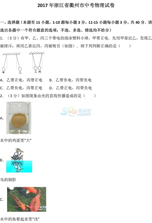 精英中考网消息:2017年浙江省衢州市中考已经结束,六月,又有一批新的考生参加2018中考,为了帮助广大考生更好的复习备考,小编收集整理了2017衢州中考各科试题及参考答案,供广大考生参考,下面是2017衢州中考物理试题试卷及答案