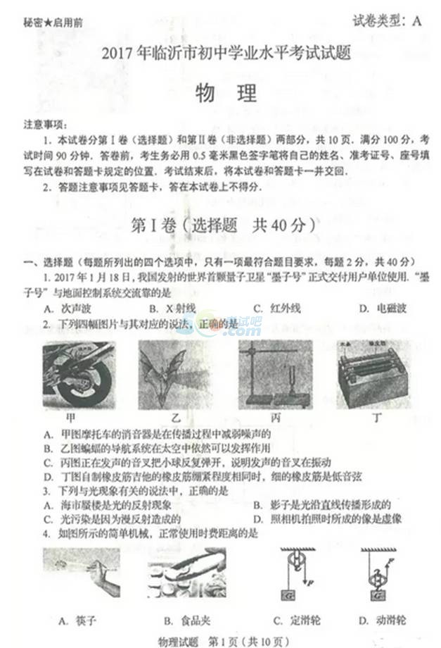 精英中考网消息:2017年山东省临沂市中考已经结束,六月,又有一批新的考生参加2018中考,为了帮助广大考生更好的复习备考,小编收集整理了2017临沂中考各科试题及参考答案,供广大考生参考,下面是2017临沂中考物理试题试卷及答案