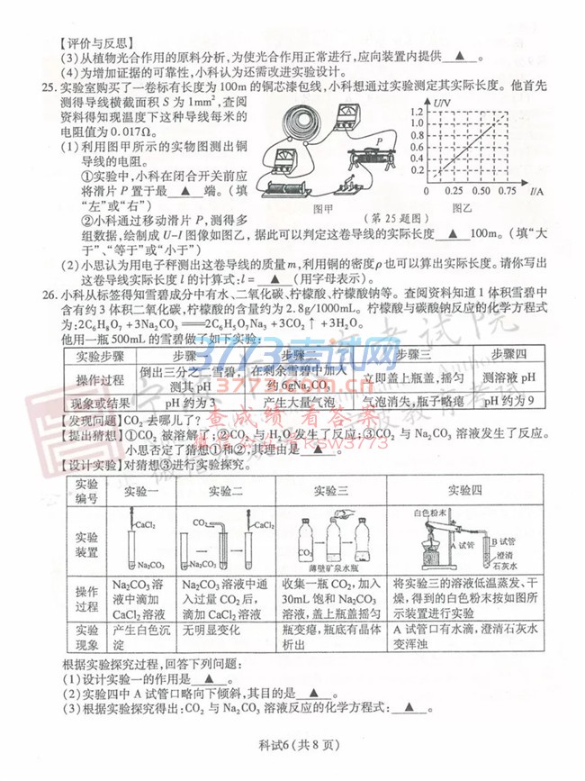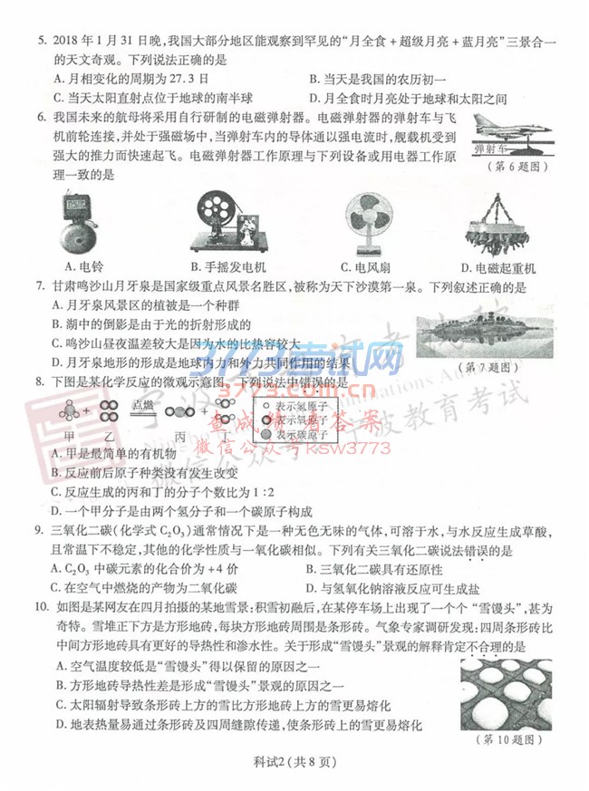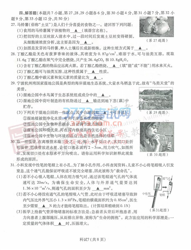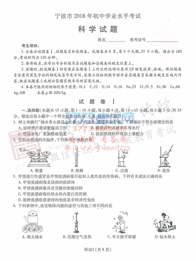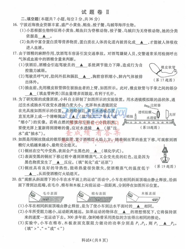 2018宁波中考科学试题及答案评分标准发布