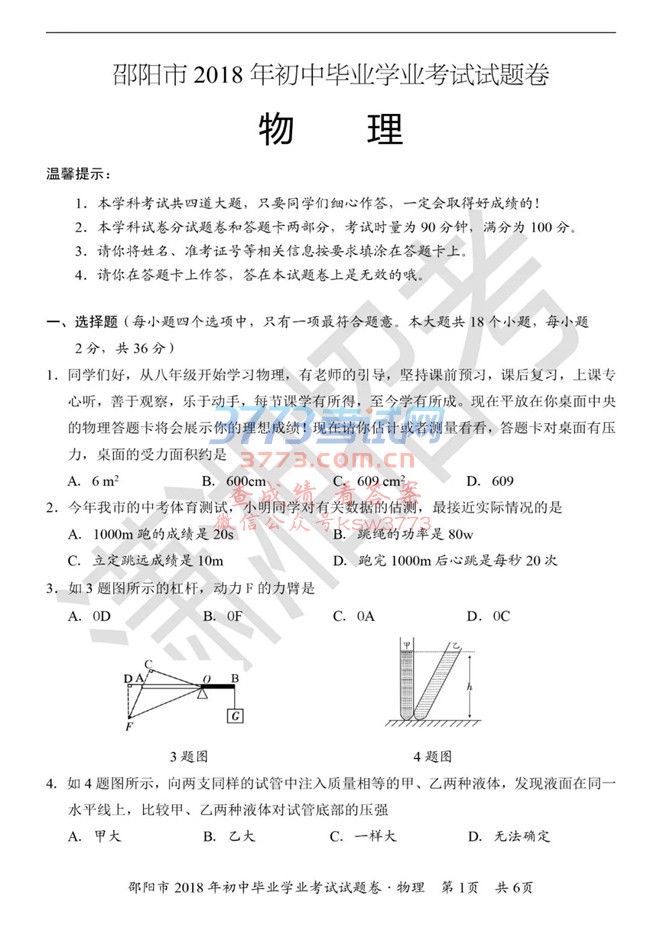 2018邵阳中考物理试题试卷及参考答案