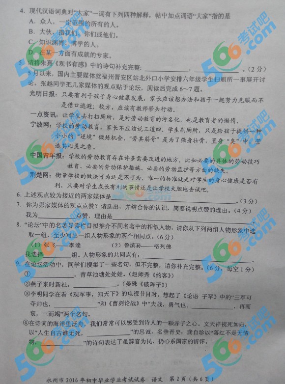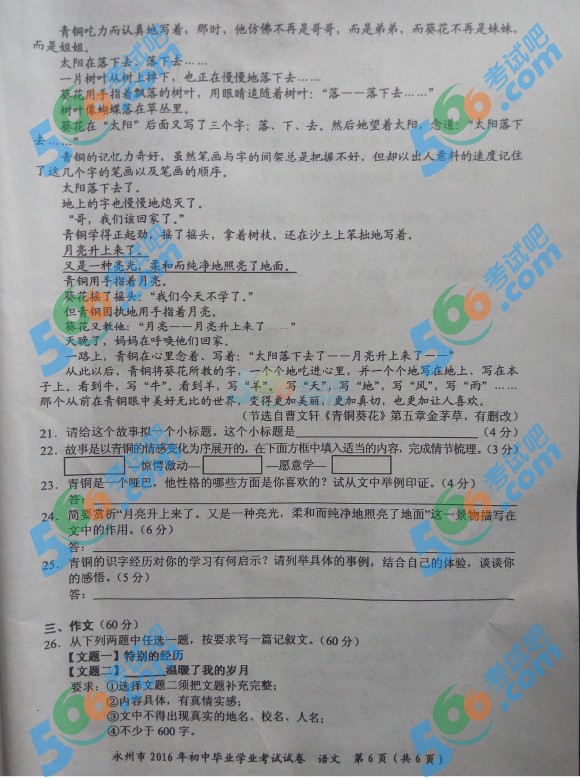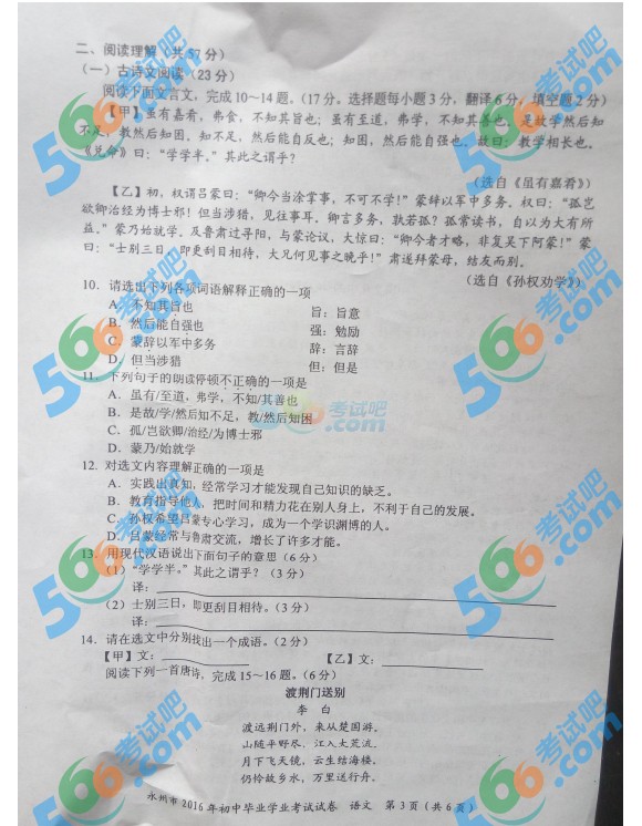 精英中考网www.52zhongkaow.com消息:2017年永州市中考已经结束,又有一批新的初三考生即将参加2018中考,为了帮助广大师生更好的备考,小编收集整理了历年永州中考试题及参考答案,供广大考生参考,下面是2016永州中考语文试题及参考答案