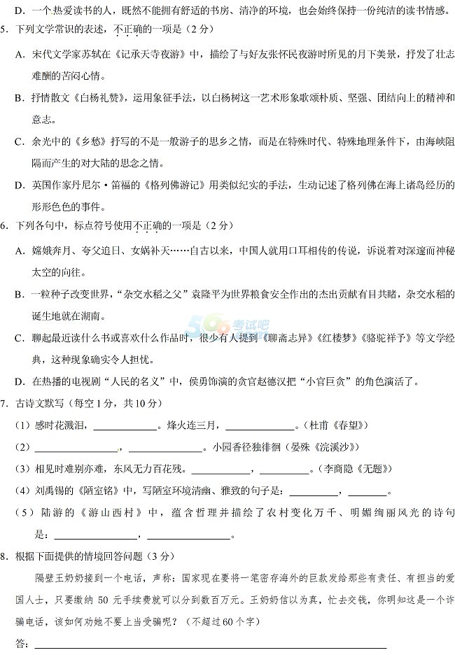 精英中考网www.52zhongkaow.com消息:2017年娄底市中考已经结束,又有一批新的初三考生即将参加2018中考,为了帮助广大师生更好的备考,小编收集整理了历年娄底中考试题及参考答案,供广大考生参考,下面是2017娄底中考语文试题及参考答案