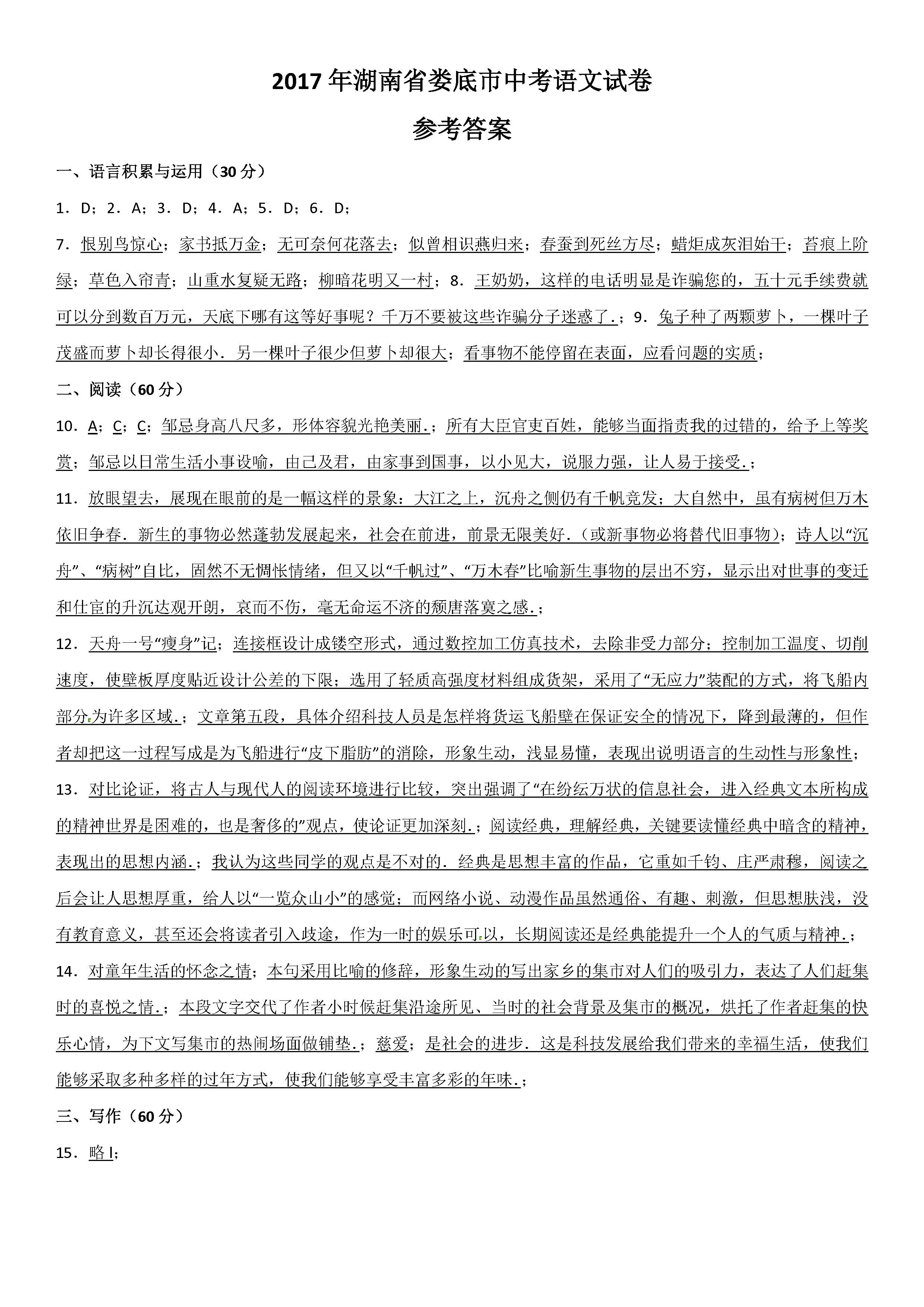 2017娄底中考语文试题试卷及答案
