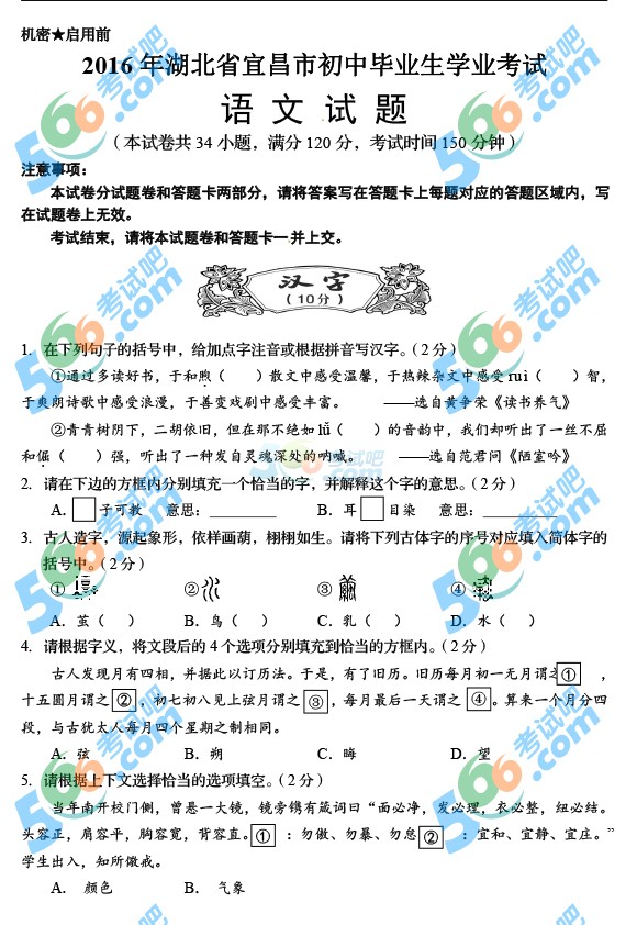 精英中考网www.52zhongkaow.com消息:2017年宜昌市中考已经结束,又有一批新的初三考生即将参加2018宜昌中考,为了帮助广大师生更好的备考,小编收集整理了历年宜昌中考试题及参考答案,供广大考生参考,下面是2017宜昌中考语文试题及参考答案