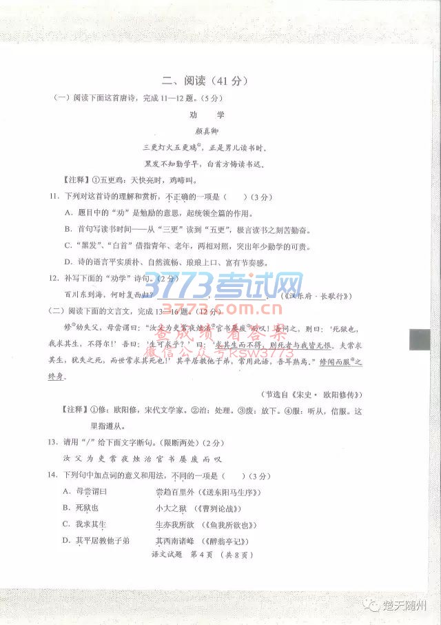 精英中考网消息:2017年湖北省随州市中考已经结束,很快又将一批新的初三考生即将参加2018中考,为了帮助广大师生更好的备考,小编收集整理了2017随州中考各科试题及参考答案,供广大考生参考,下面是2017随州中考语文试卷试题及参考答案