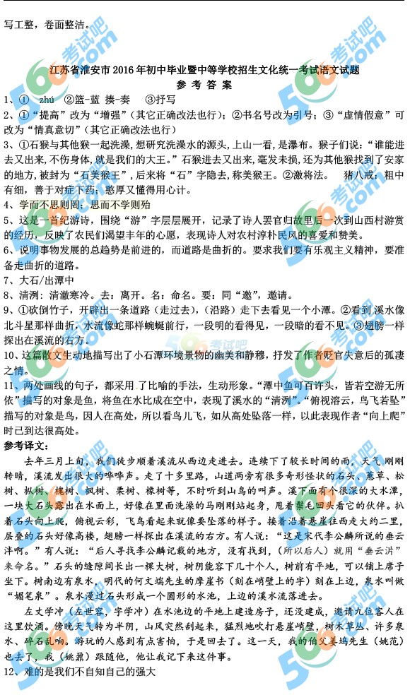 精英中考网消息:2016年江苏省淮安市中考已经结束,六月,又有一批新的考生参加2018中考,为了帮助广大考生更好的复习备考,小编收集整理了2016淮安中考各科试题及参考答案,供广大考生参考,下面是2016淮安中考语文试题试卷及答案