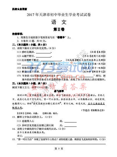 精英中考网消息:2017年山东省天津市中考已经结束,六月,又有一批新的考生参加2018中考,为了帮助广大考生更好的复习备考,小编收集整理了2017天津中考各科试题及参考答案,供广大考生参考,下面是2017天津中考语文试题试卷及答案