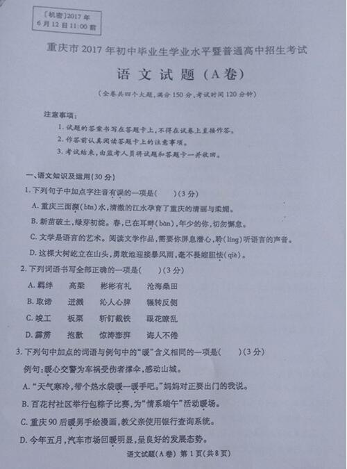 精英中考网消息:2017年重庆市中考已经结束,六月,又有一批新的考生参加2018中考,为了帮助广大考生更好的复习备考,小编收集整理了2017重庆中考各科试题及参考答案,供广大考生参考,下面是2017重庆中考语文试题试卷及答案(A卷)