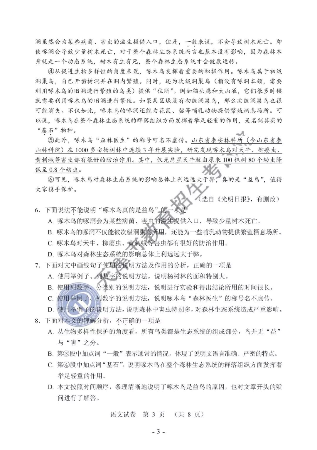 2019天津中考语文试卷试题及参考答案