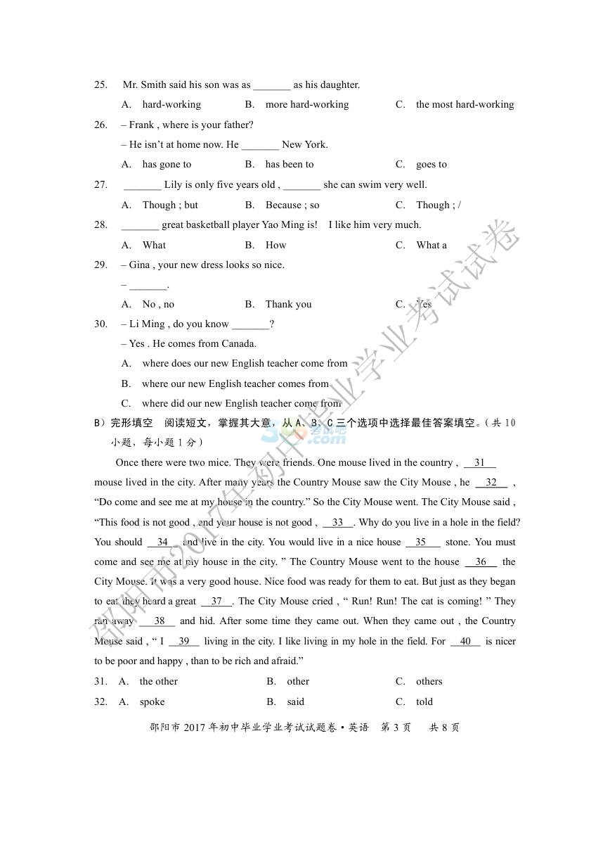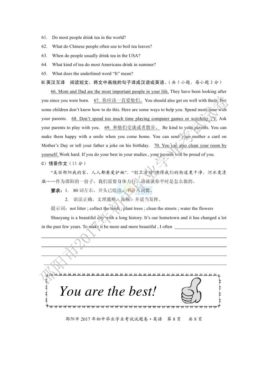 精英中考网www.52zhongkaow.com消息:2017年邵阳市中考已经结束,又有一批新的初三考生即将参加2018中考,为了帮助广大师生更好的备考,小编收集整理了历年邵阳中考试题及参考答案,供广大考生参考,下面是2017邵阳中考英语文试题及答案解析