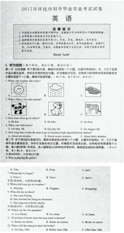 精英中考网www.52zhongkaow.com消息:2017年怀化市中考已经结束,又有一批新的初三考生即将参加2018中考,为了帮助广大师生更好的备考,小编收集整理了历年怀化中考试题及参考答案,供广大考生参考,下面是2017怀化中考英语试卷试题及参考答案