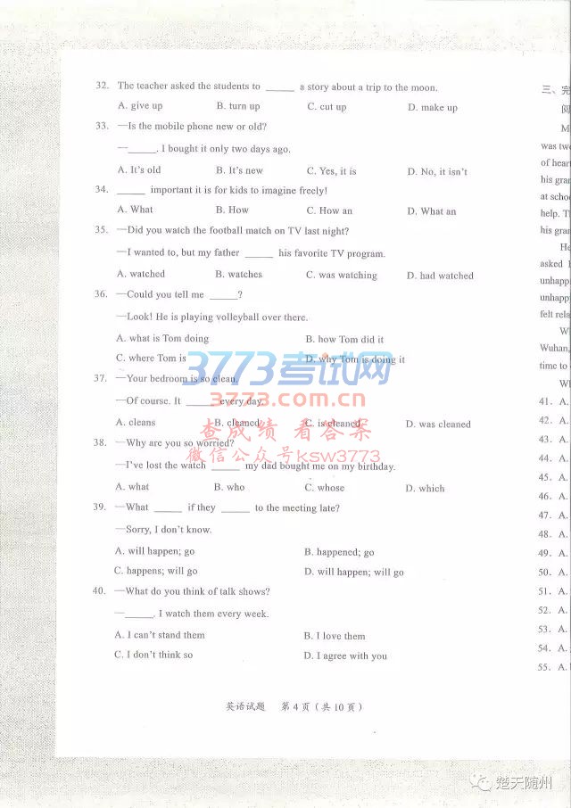 2017随州中考英语试题及答案发布