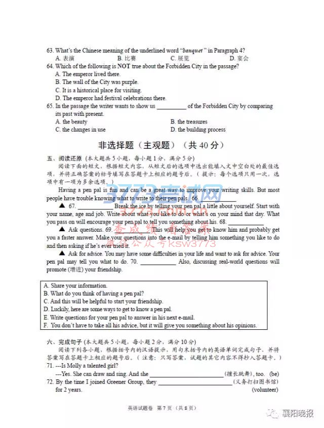 精英中考网消息:2017年湖北省襄阳市中考已经结束,很快又将一批新的初三考生即将参加2018中考,为了帮助广大师生更好的备考,小编收集整理了2017襄阳中考各科试题及参考答案,供广大考生参考,下面是2017襄阳中考英语试题试卷及参考答案
