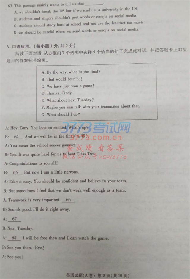 重庆市2017年中考英语试题(A卷,图片版,含答案)